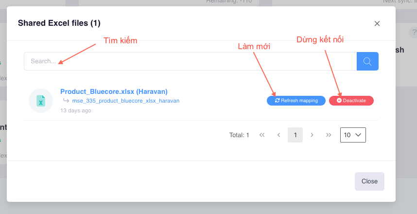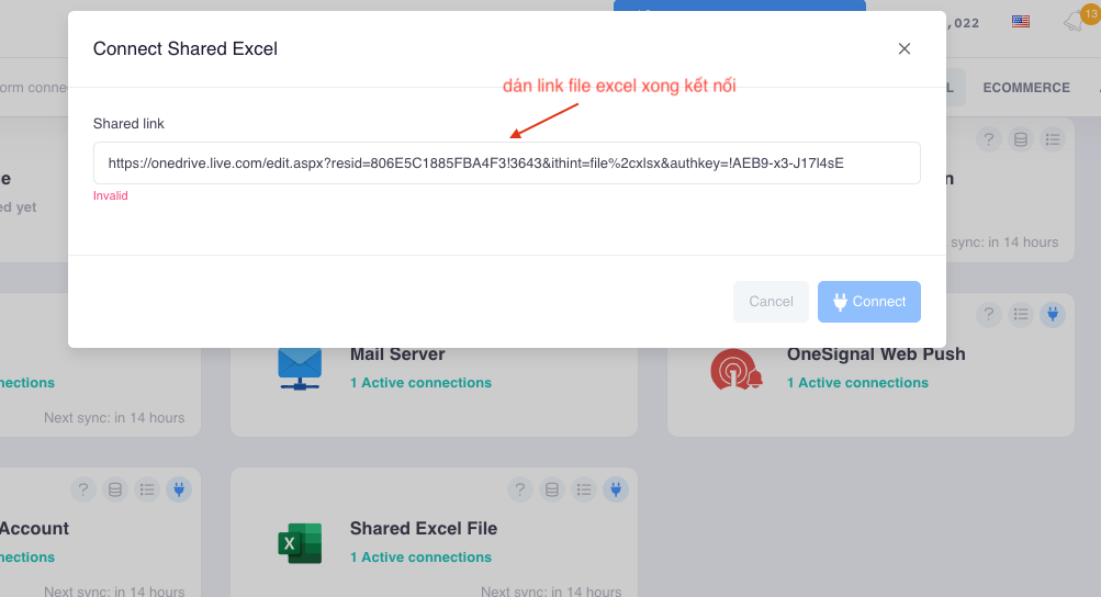 Bước 2: Xuất hiện cổng modal để gán link Shared Excel File và kết nối.
