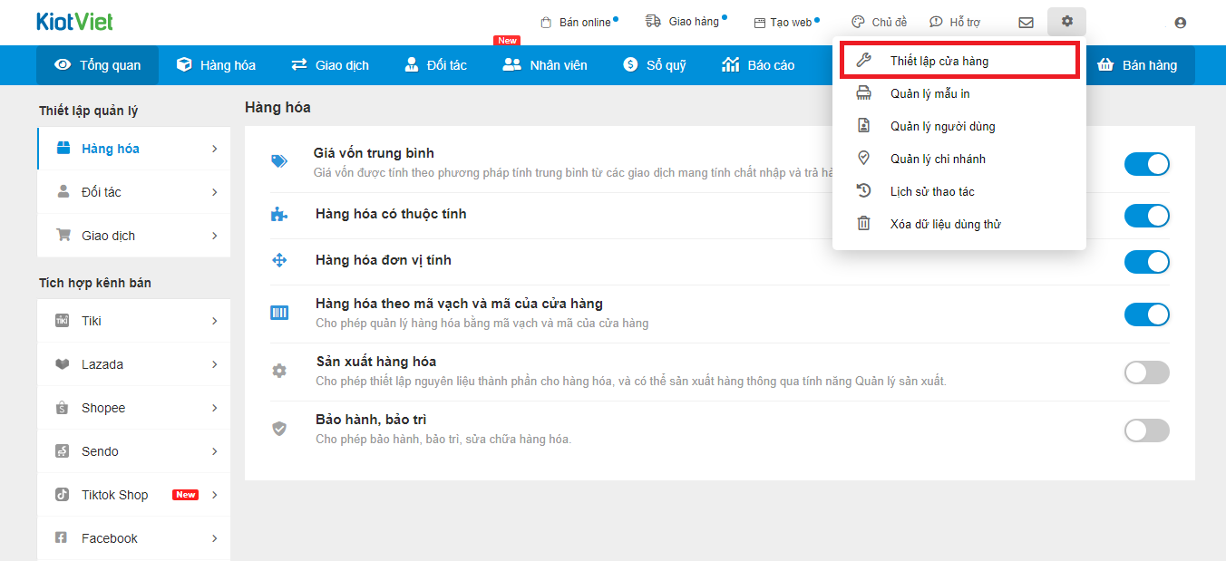 Bước 2: Mở 1 tab mới để truy cập vào trang quản lý bán hàng của Kiotviet. Chọn “Thiết lập cửa hàng”
