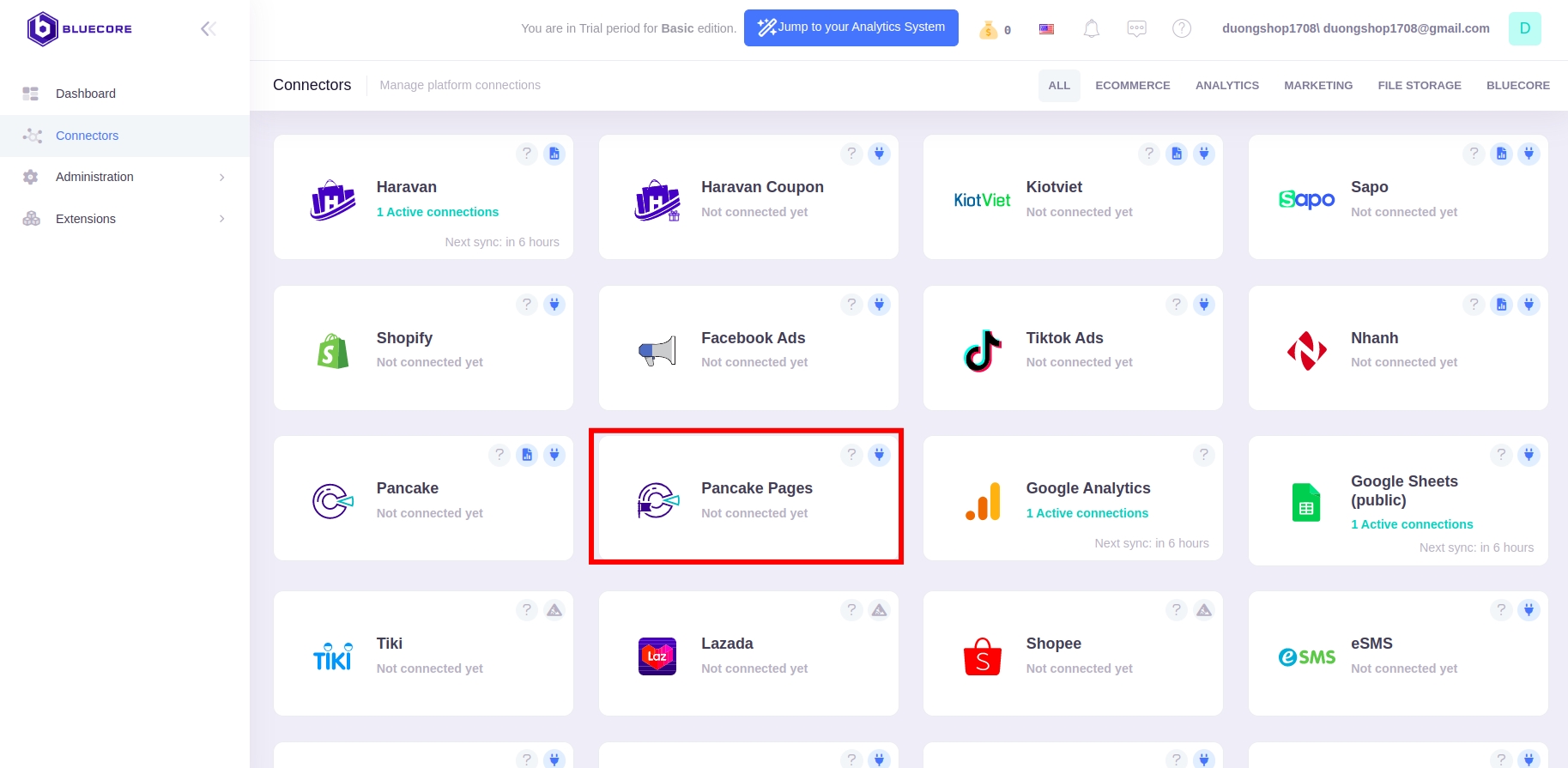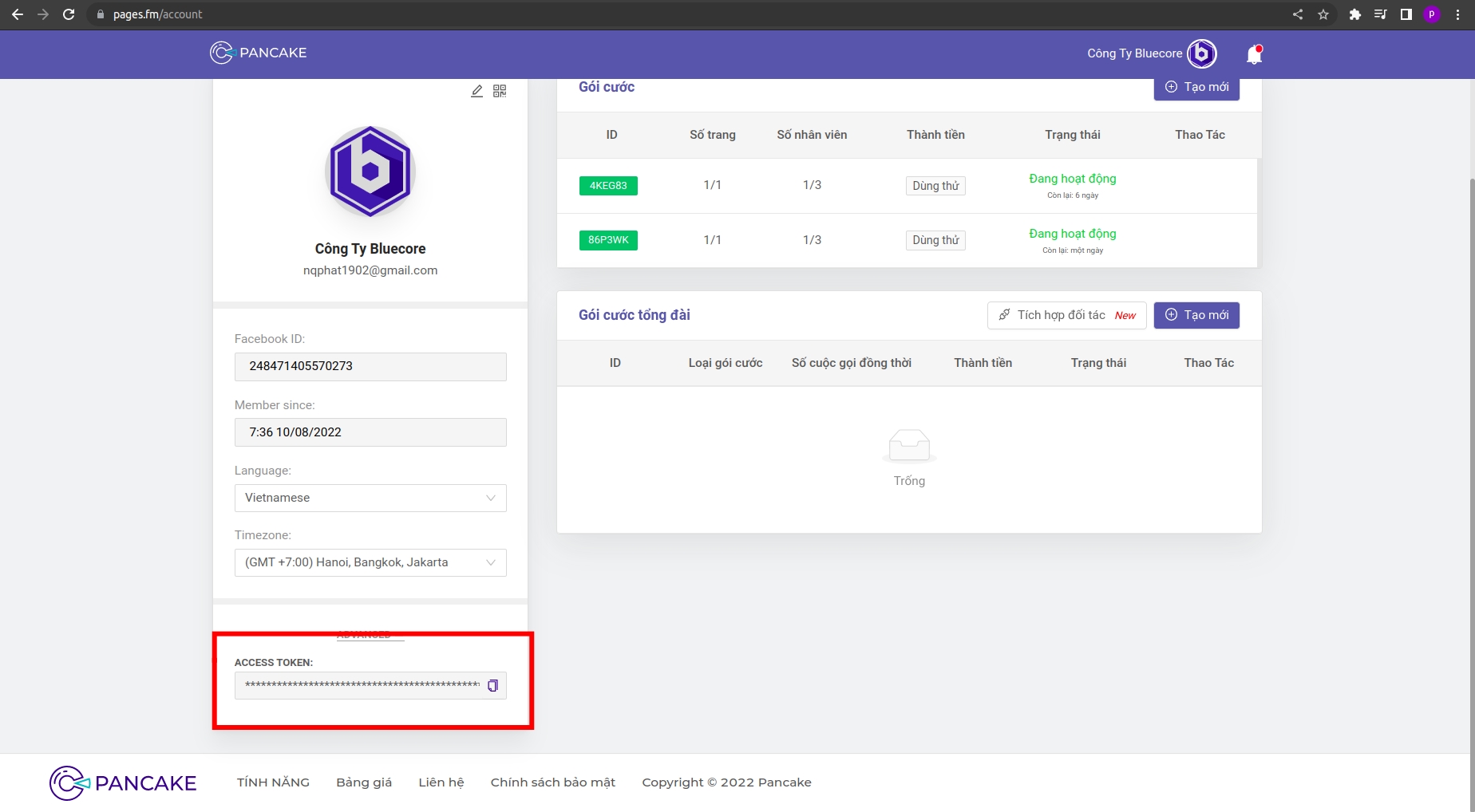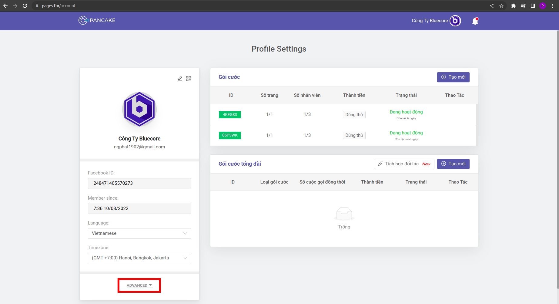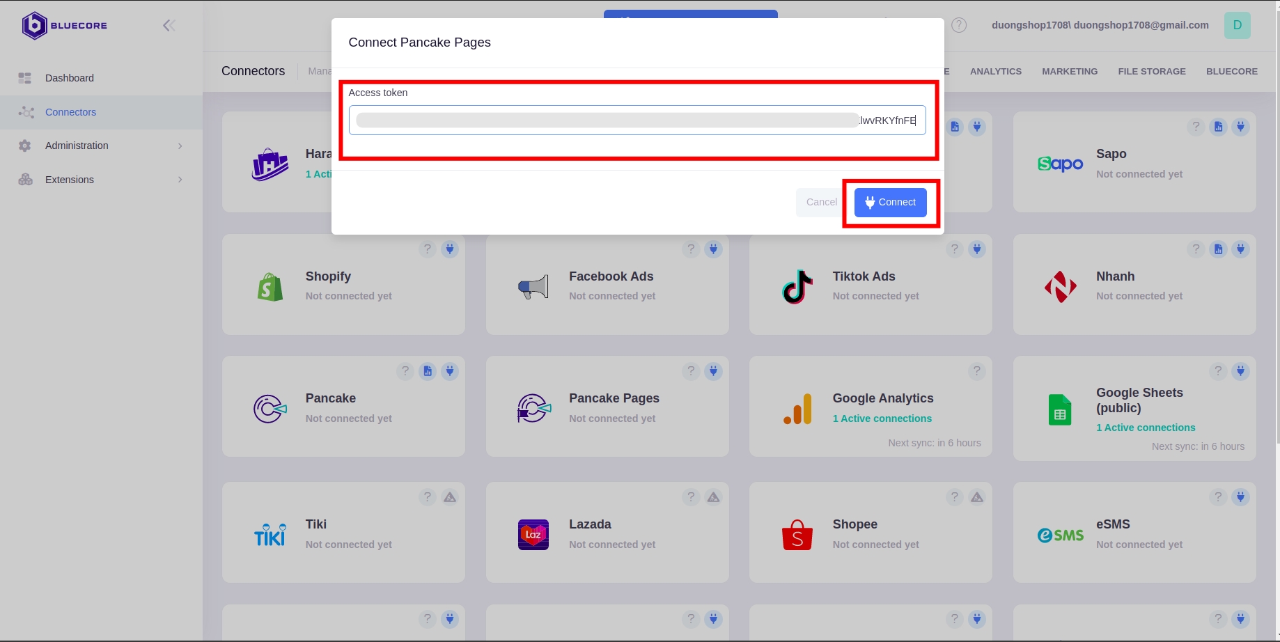 Vào lại trang chủ của Bluecore, nhấn vào mục Pancake pages và nhấn vào nút kết nối