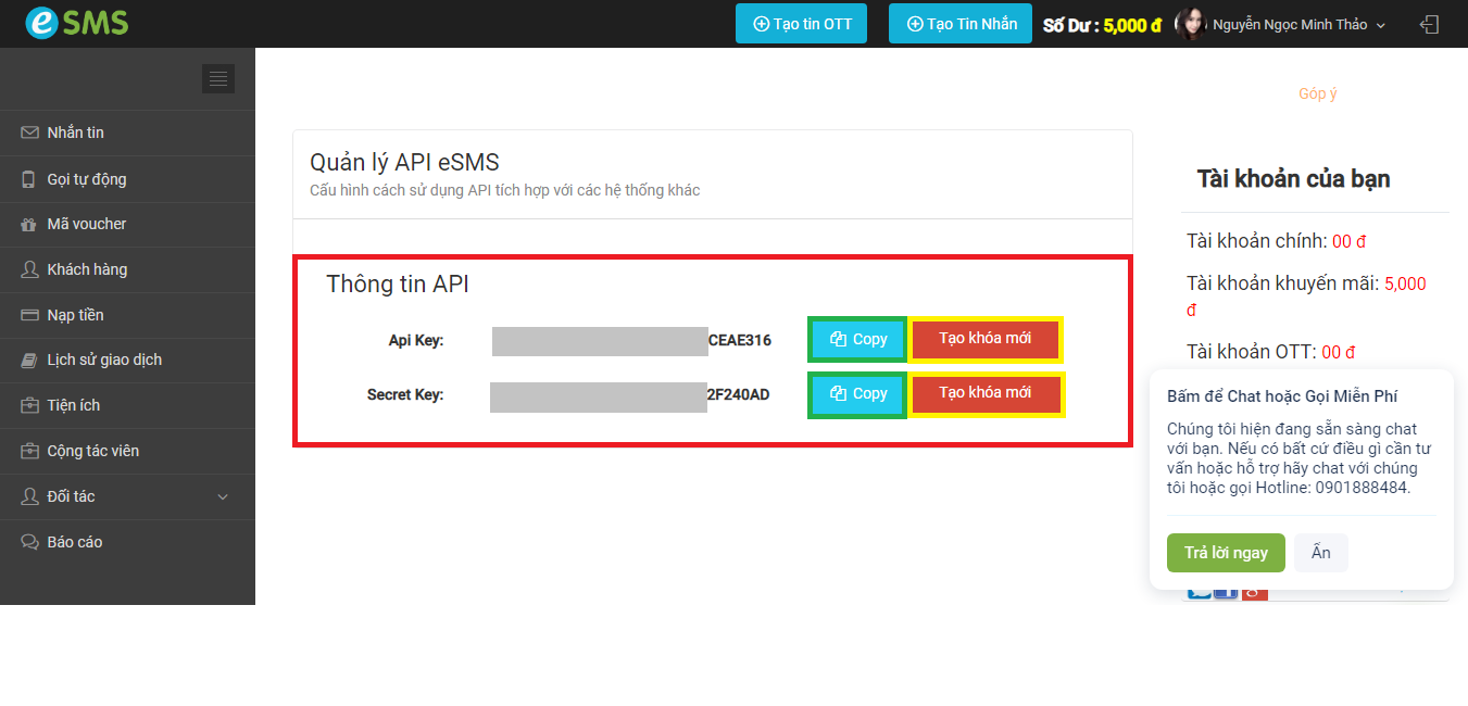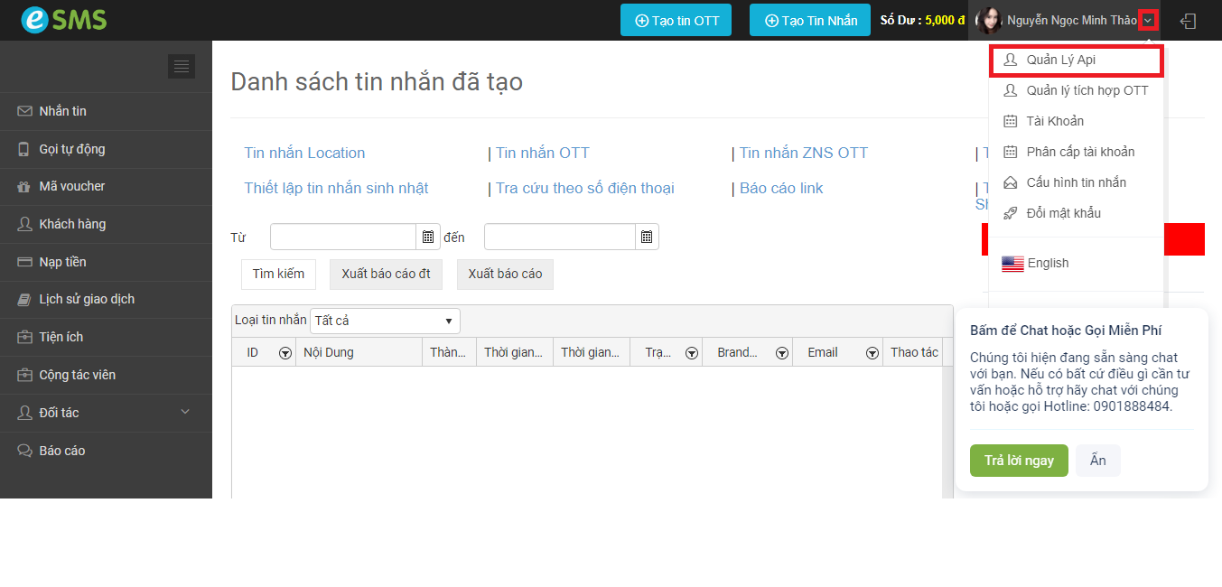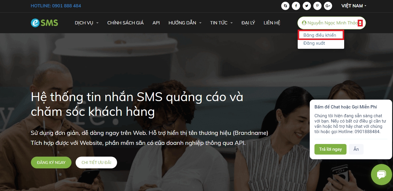 Bước 2: Mở 1 tab mới, truy cập vào tài khoản ESMS của bạn