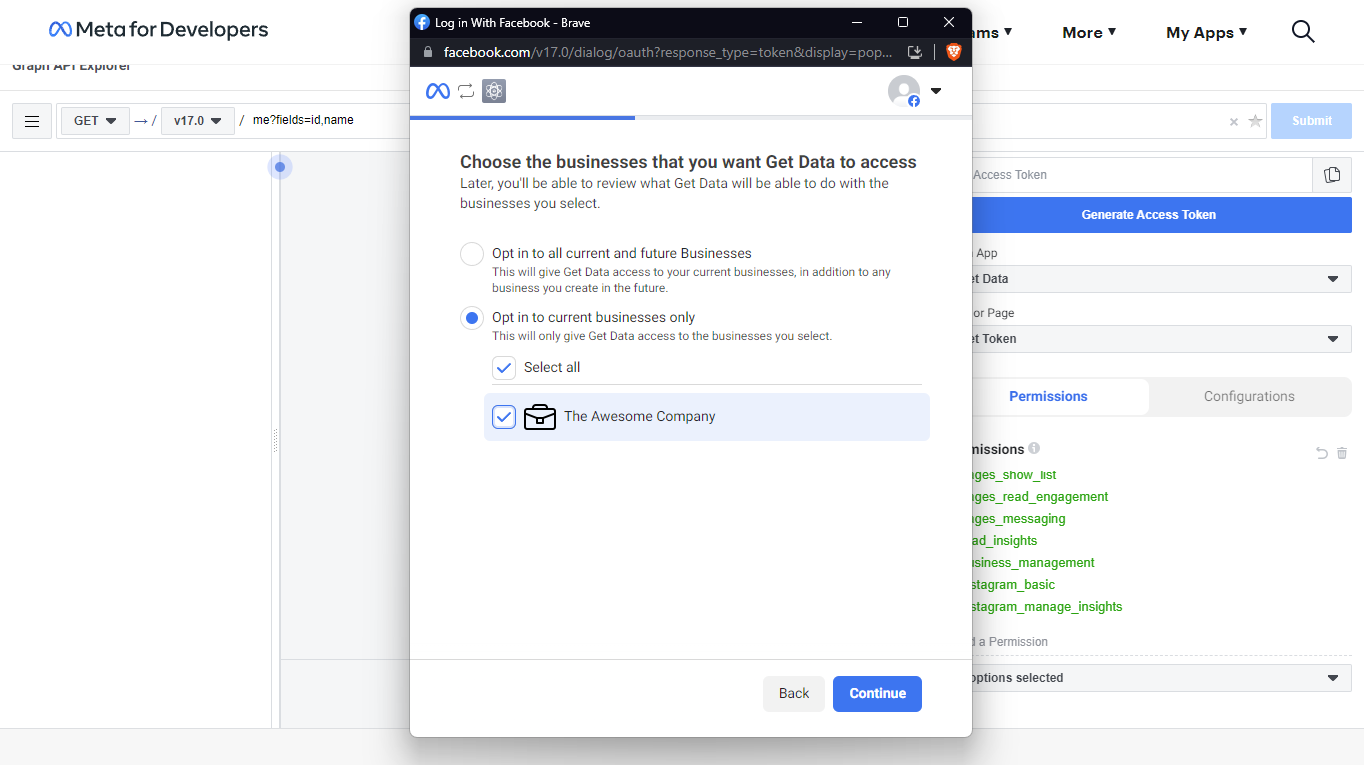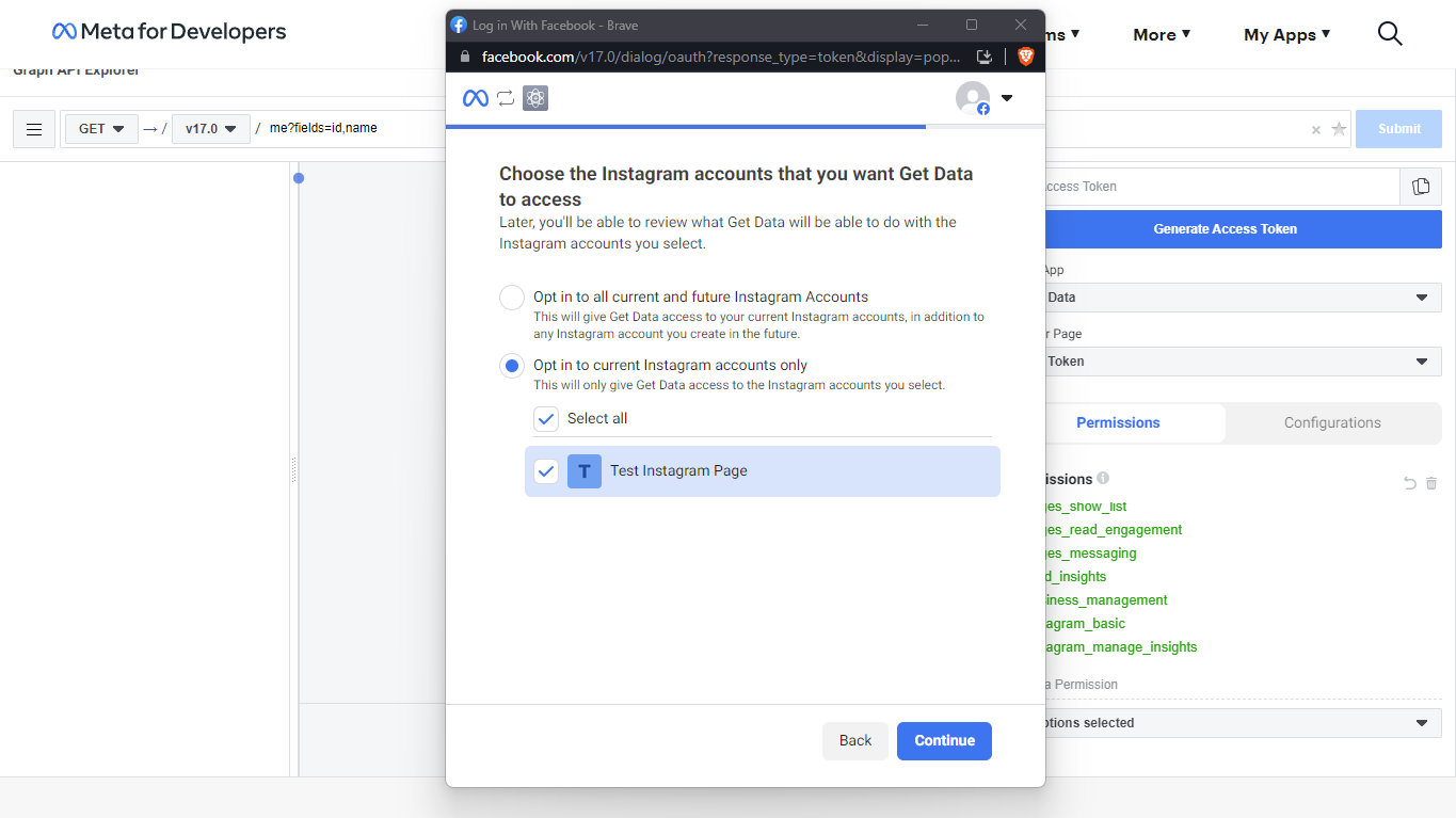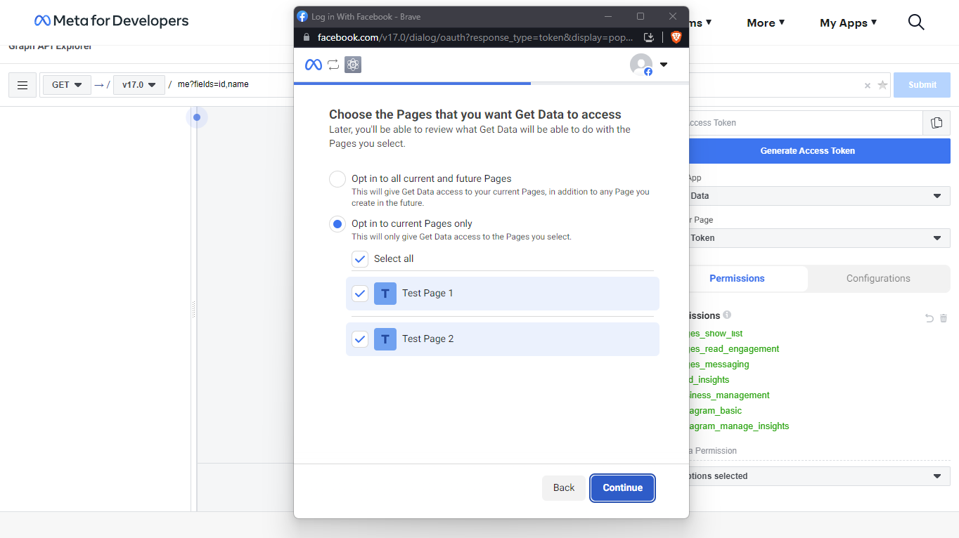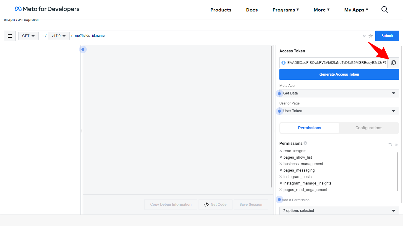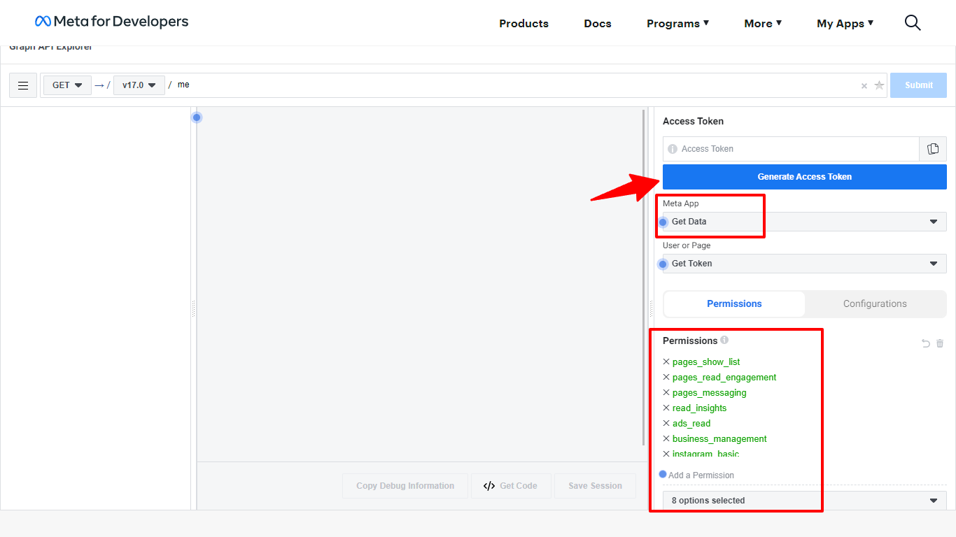 Truy cập [Graph API Explorer](https://developers.facebook.com/tools/explorer/). Tại thanh công cụ bên phải, chọn ứng dụng của bạn trong mục "Meta App" và thêm các quyền sau vào mục "Permissions" sau đó nhấp chọn nút "Generate Access Token"
