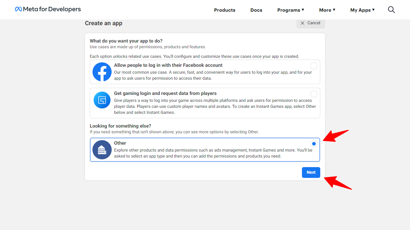 Chọn mục đích sử dụng là "Other", sau đó nhấp nút "Next"
