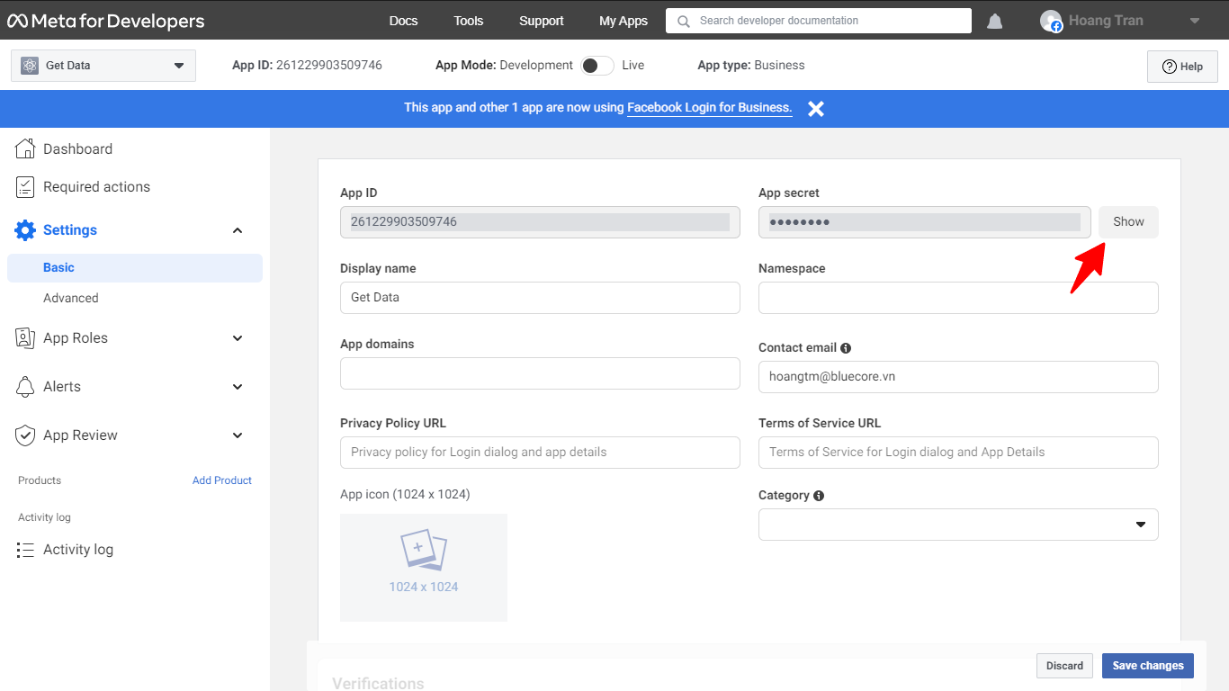 Nhấp vào nút "Show" để hiển thị thông tin "App secret" *(Facebook có thể yêu cầu nhập lại mật khảu tài khoản Facebook của bạn để xác nhận)*