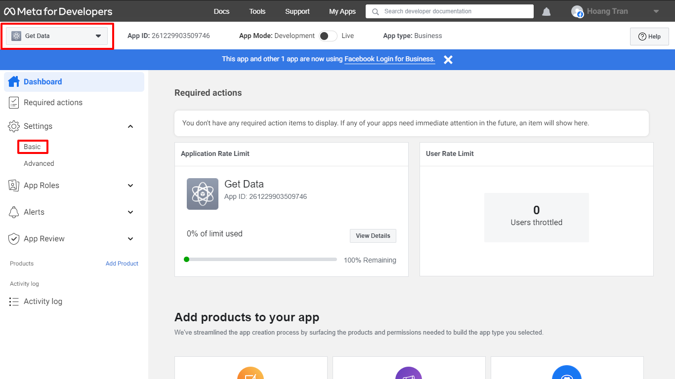 Tại màn hình quản lý ứng dụng, nhấp vào menu "Settings" -> "Basic"