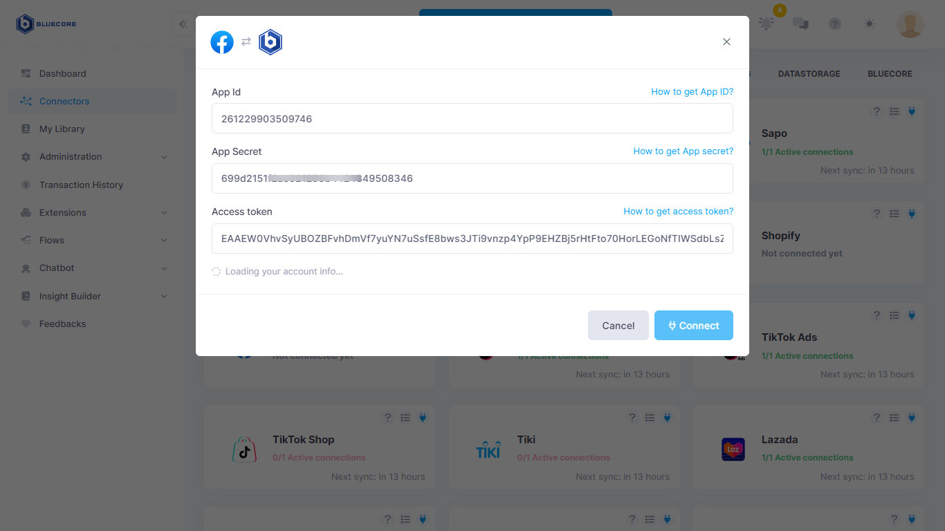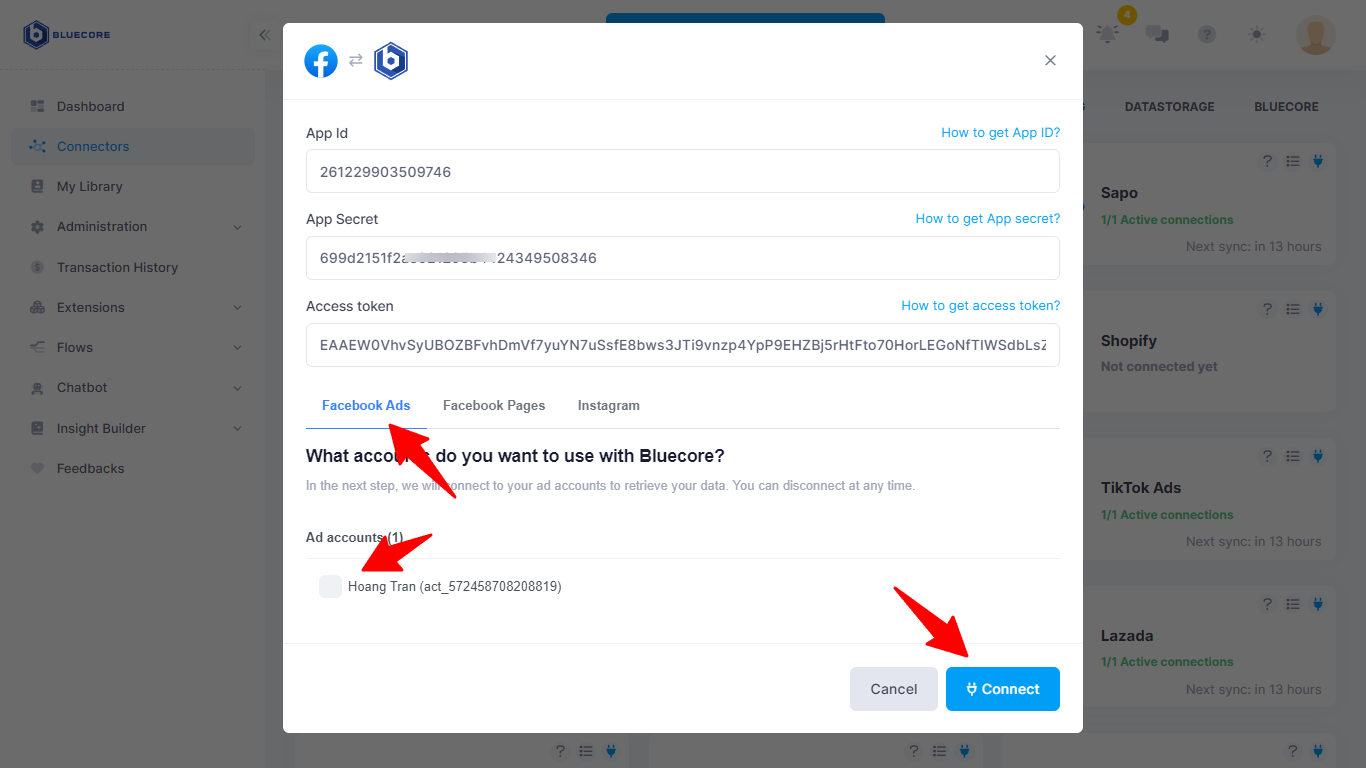 Truy cập [trang quản trị kết nối](https://admin.bluecore.vn/app/main/connectors) của Bluecore, chọn kết nối `Facebook Graph` và điền các thông tin: