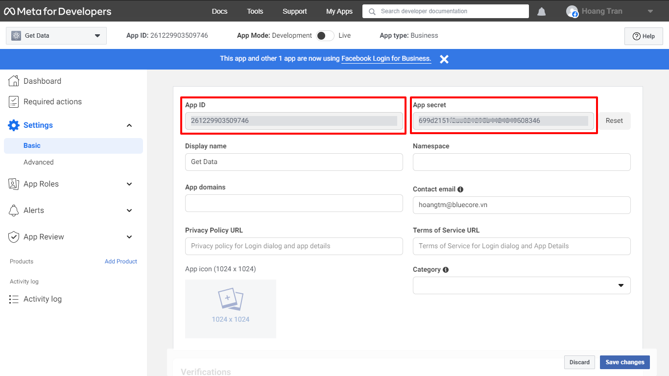 Lưu lại 2 giá trị "App ID" và "App secret" để dùng khi kết nối tại Bluecore ở [Bước 5](#buoc-5-tao-ket-noi-meta-graph-tren-bluecore)