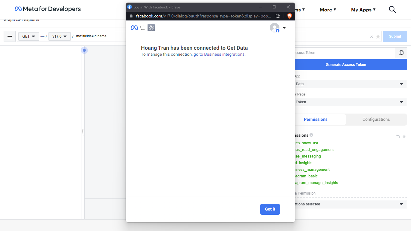 Sau khi cấp quyền, Facebook sẽ hiển thị thông tin Access Token, lưu lại giá trị này