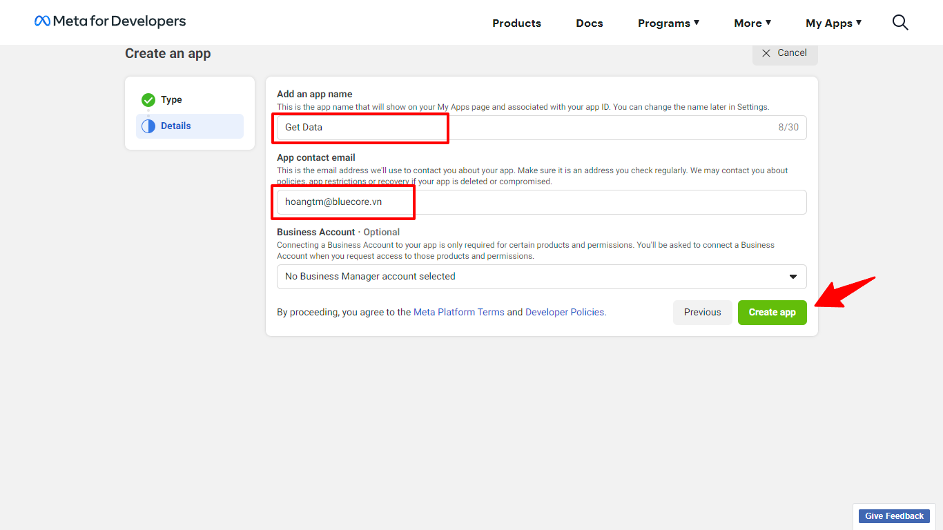 Đặt tên ứng dụng và điền email của bạn sau đó nhấp nút "Create app"