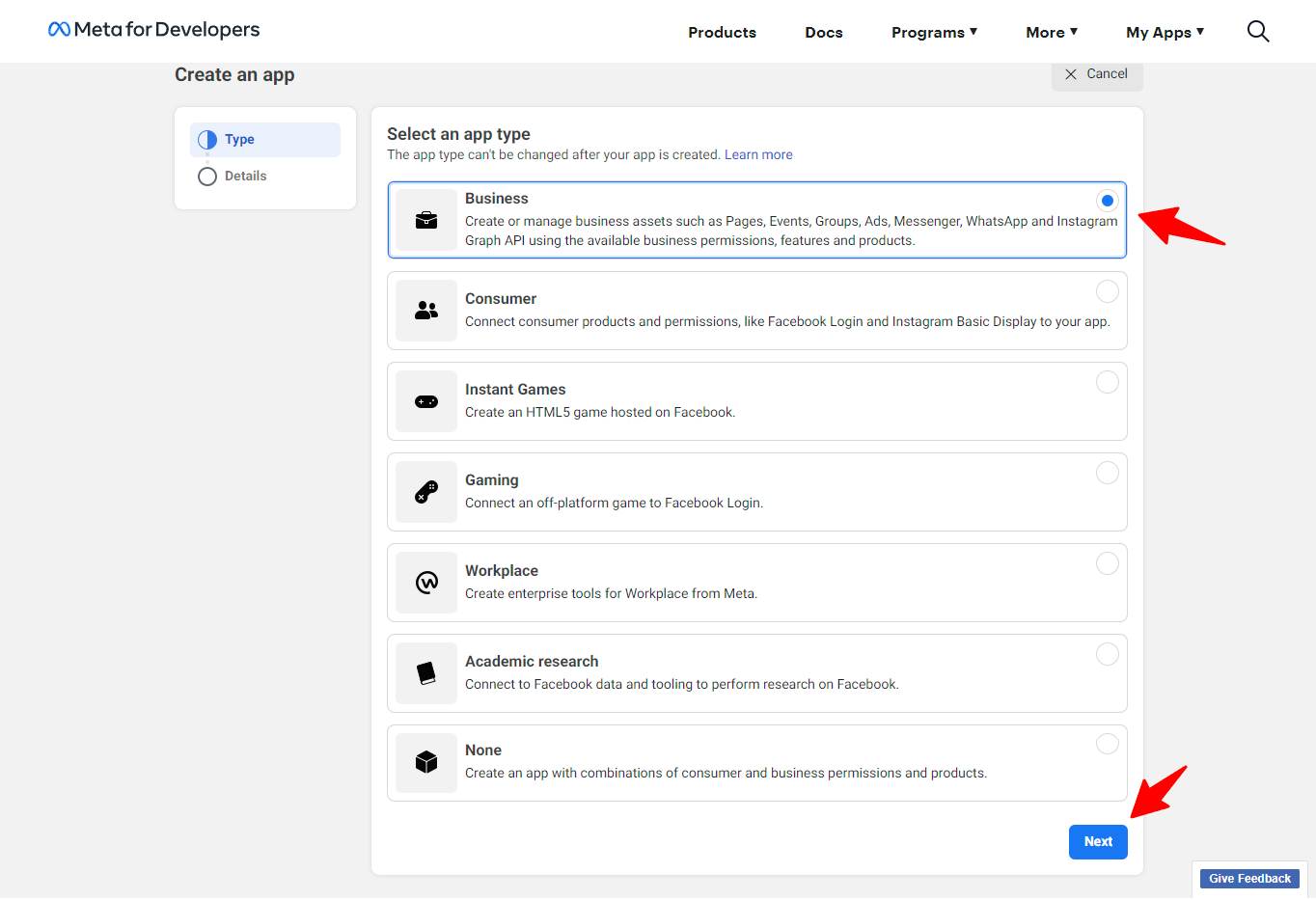 Chọn loại ứng dụng là "Bussiness" sau đó nhấp nút "Next"