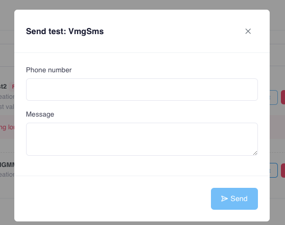 Nhấn vào nút Send test để mở màn hình gửi thử tin nhắn. Nhập số điện thoại bạn muốn nhận tin và nội dung tin nhắn sau đó bấm Send để gởi.