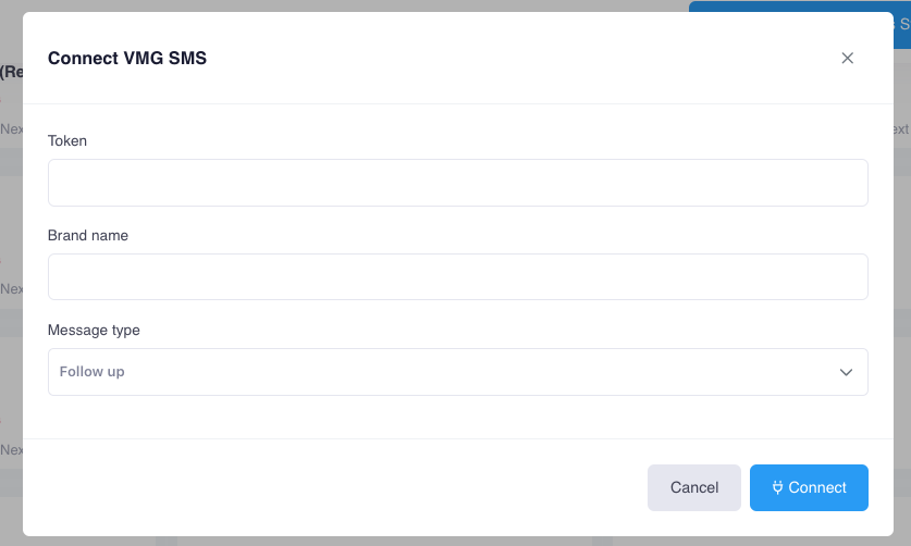 Nhập đầy đủ thông tin trong form và kết nối. Nếu bạn chưa có thông tin Token và Brand name, vui lòng liên hệ bộ phận chăm sóc khách hàng của VMG để được hỗ trợ