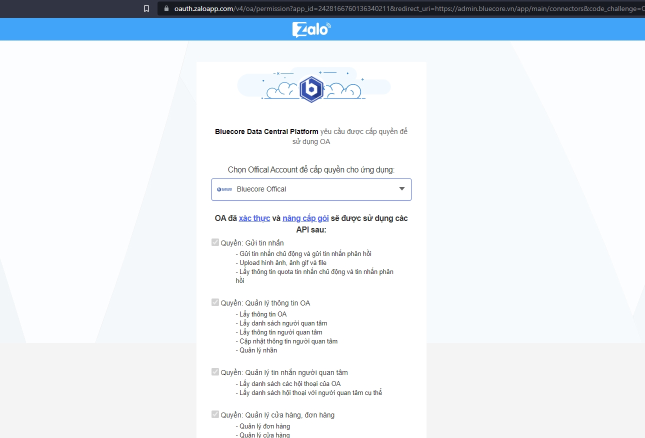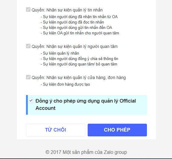 Tại đây, bạn tích vào mục “Đồng ý cho phép ứng dụng quản lý Official Account” và nhấn nút “CHO PHÉP”