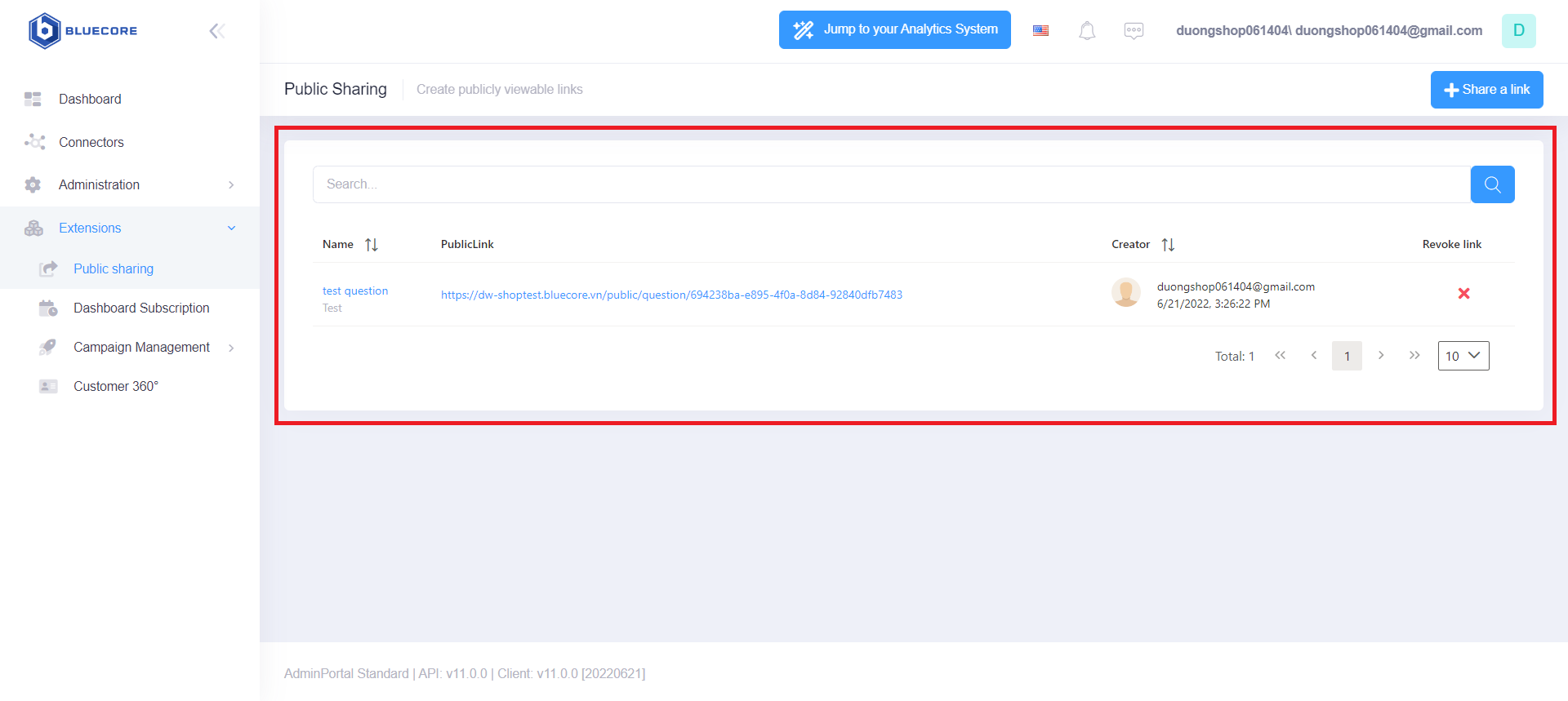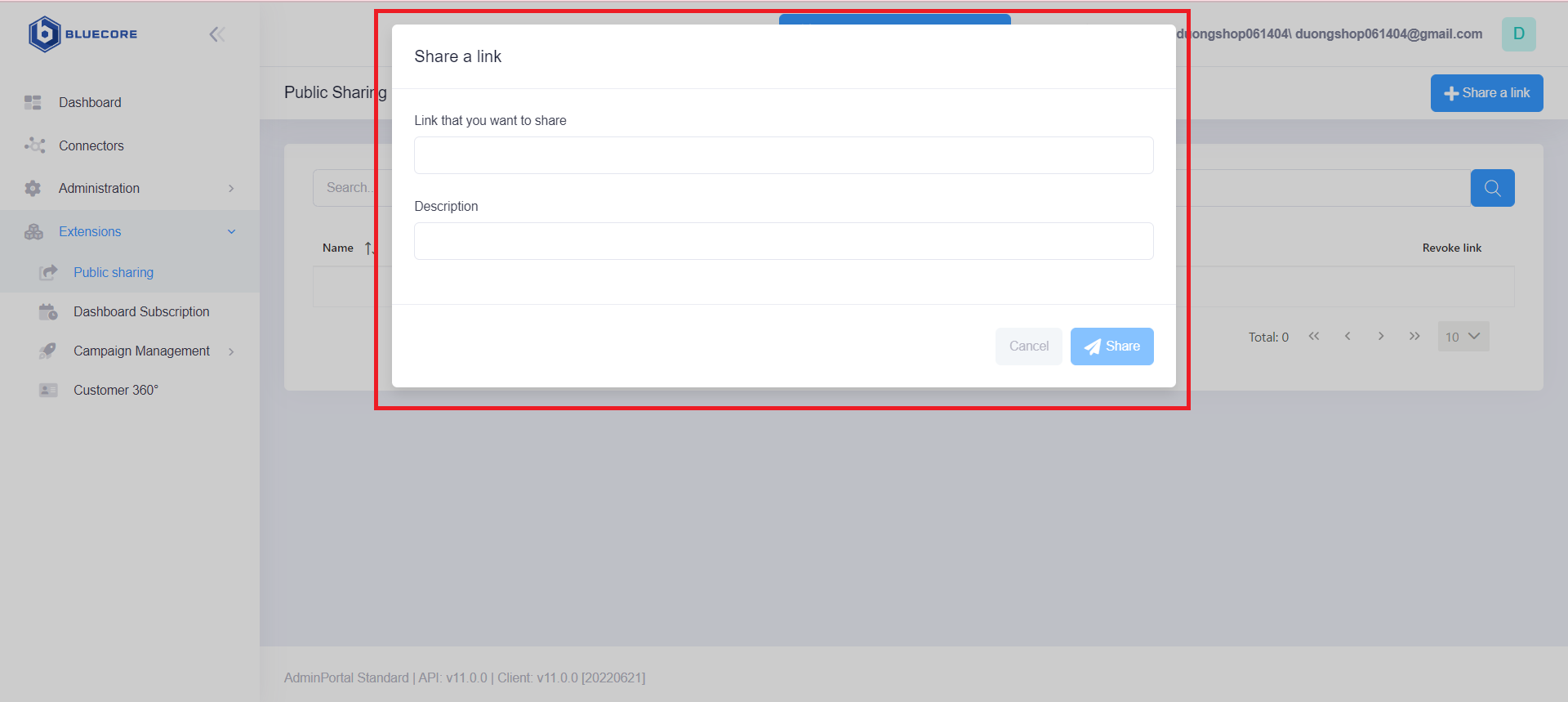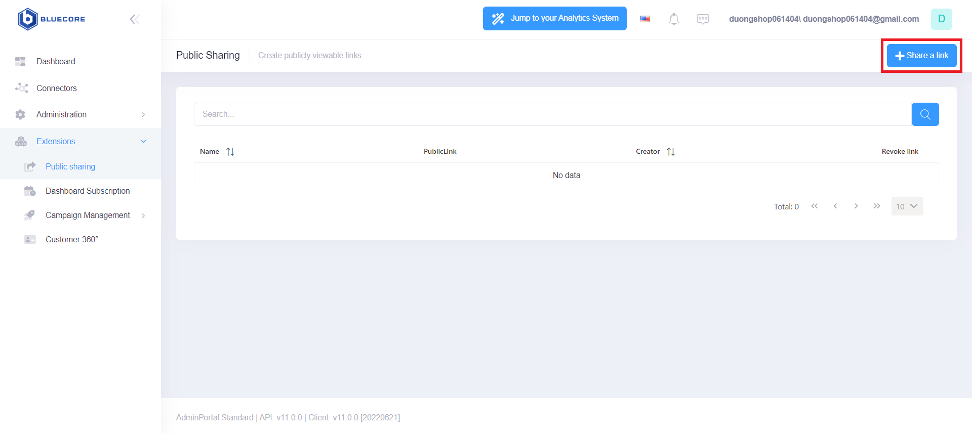 Bước 1: Click vào nút share a link ở góc phía trên bên phải màn hình để chia sẻ liên kết công khai. Liên kết đó sẽ là những question trong hệ thống Metabase được liên kết với Bluecore.