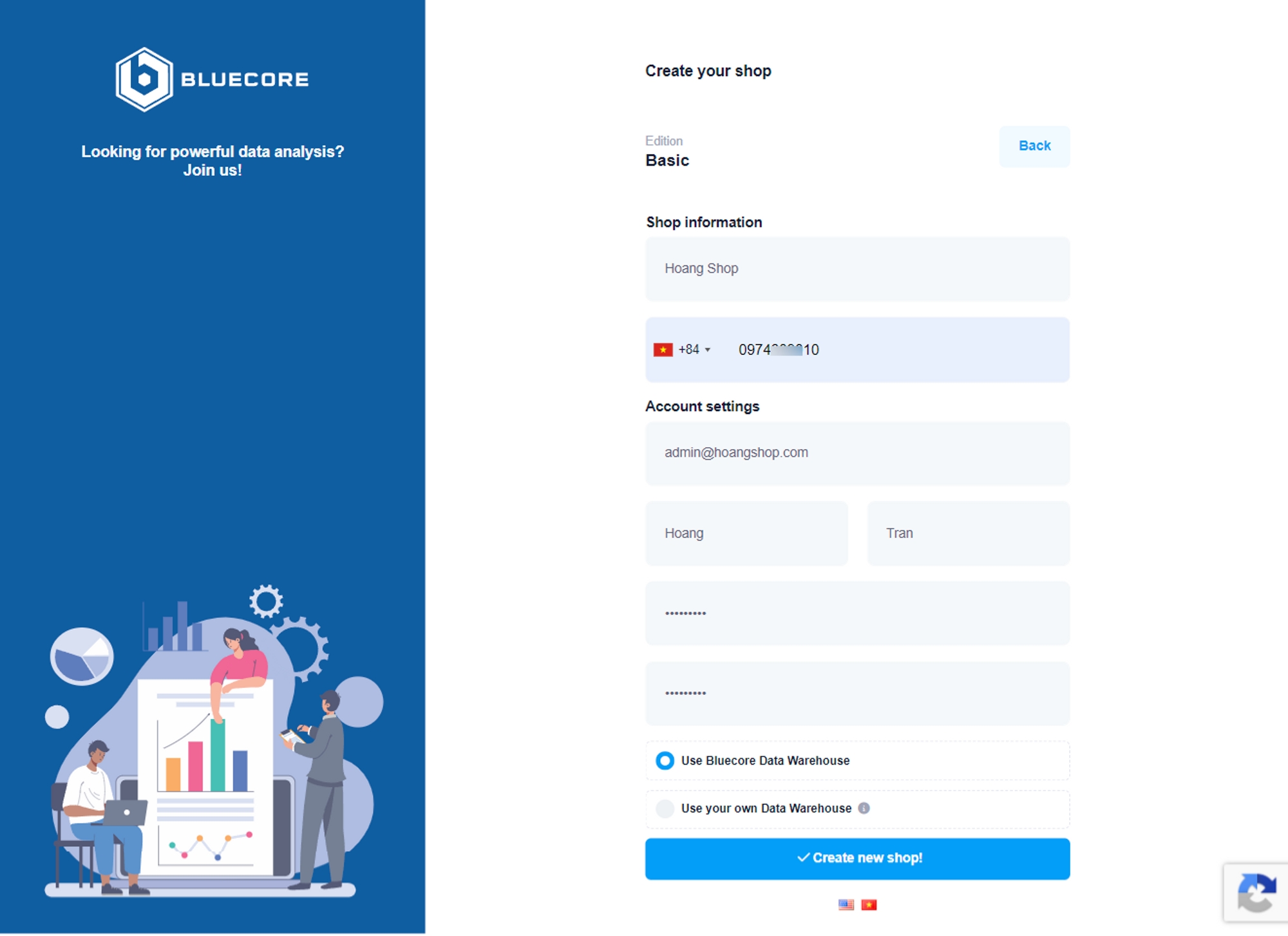 Bluecore sử dụng Google BigQuery để lưu trữ dữ liệu của bạn, trường hợp bạn đã có tài khoản Google BigQuery và muốn sử dụng kho lưu trữ riêng, nhấn chọn “Use you own Data Warehouse” và làm theo hướng dẫn tại Hướng dẫn sử dụng BigQuery riêng để làm kho lưu trữ dữ liệu tại Bluecore