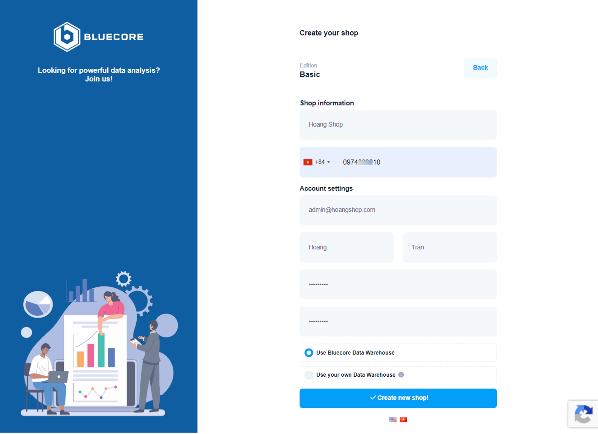 > Bluecore sử dụng **Google BigQuery** để lưu trữ dữ liệu của bạn, trường hợp bạn đã có tài khoản **Google BigQuery** và muốn sử dụng kho lưu trữ riêng, nhấn chọn “**Use you own Data Warehouse**” và làm theo hướng dẫn tại [Hướng dẫn sử dụng BigQuery riêng để làm kho lưu trữ dữ liệu tại Bluecore](https://help.bluecore.vn/blog/huong-dan-su-dung-bigquery-rieng-de-lam-kho-luu-tru-du-lieu-tai-bluecore)